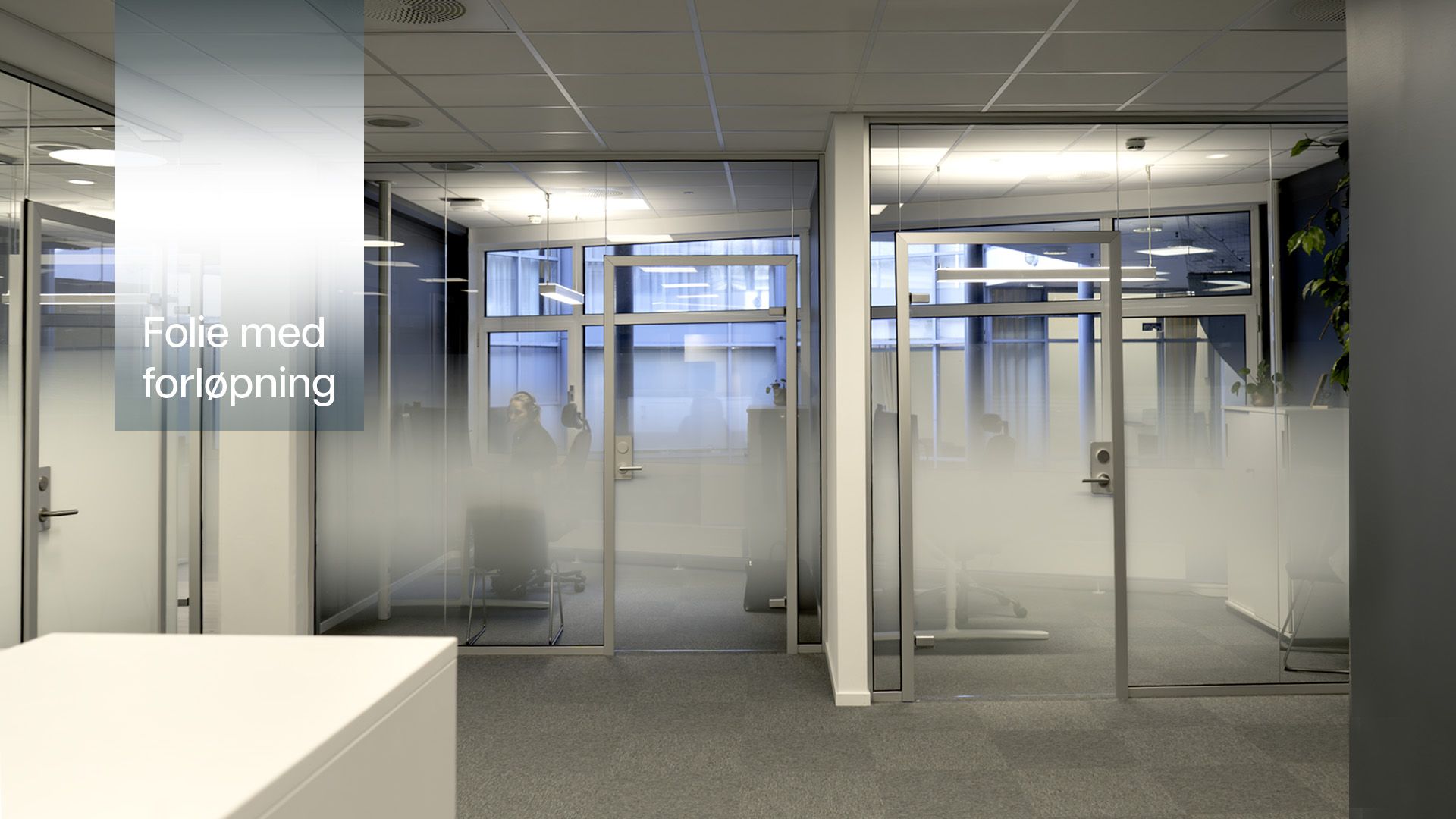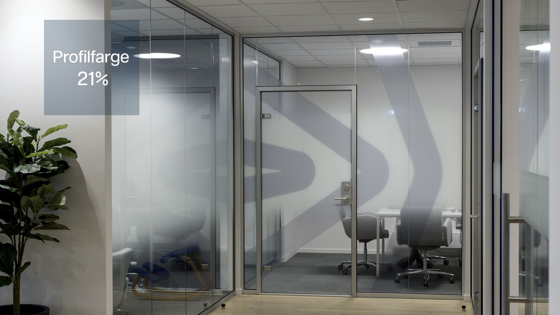 I møterommene er symbolet printet på transparent folie i en nedtonet logofarge. Det gir en myk fargeeffekt uten å dominere rommet. På innsiden av glassene er det brukt gradientfolie som skjermer i synshøyde – effektivt for både personer og skjermer.